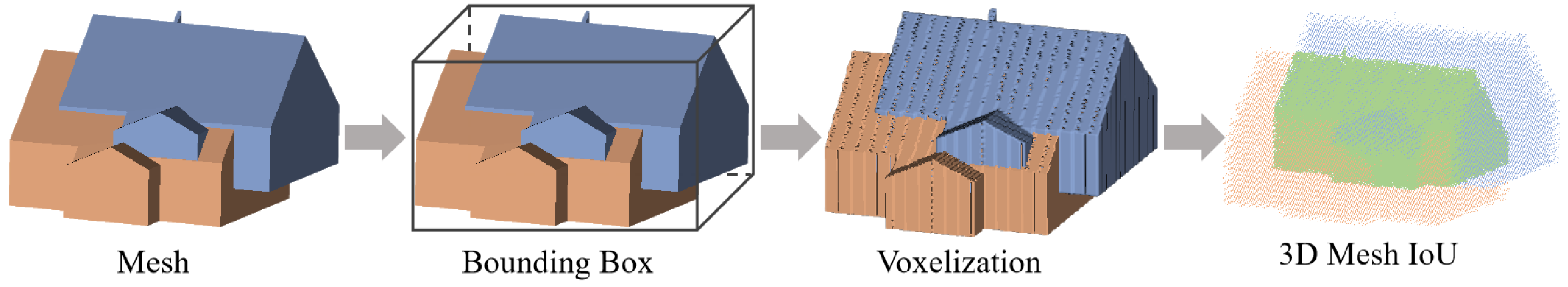 3D Mesh IoU is a metric for evaluation of the fit between generated mesh models and ground truth mesh models. We develop a numerical solution to use mesh models for 3D IoU to represent fitting errors.